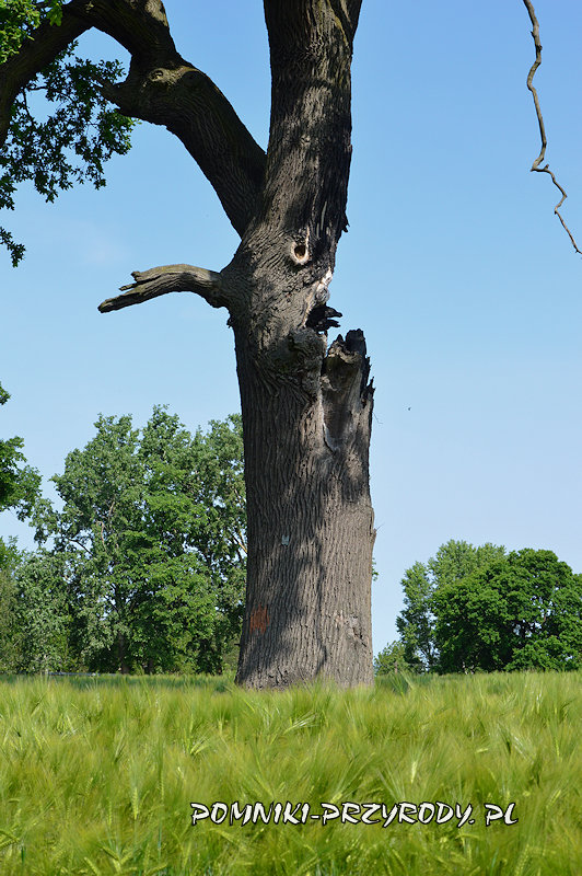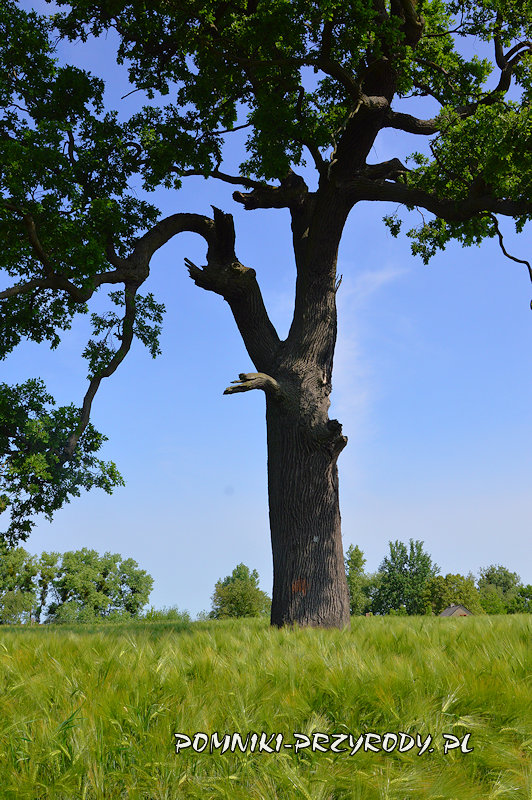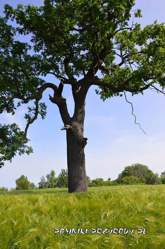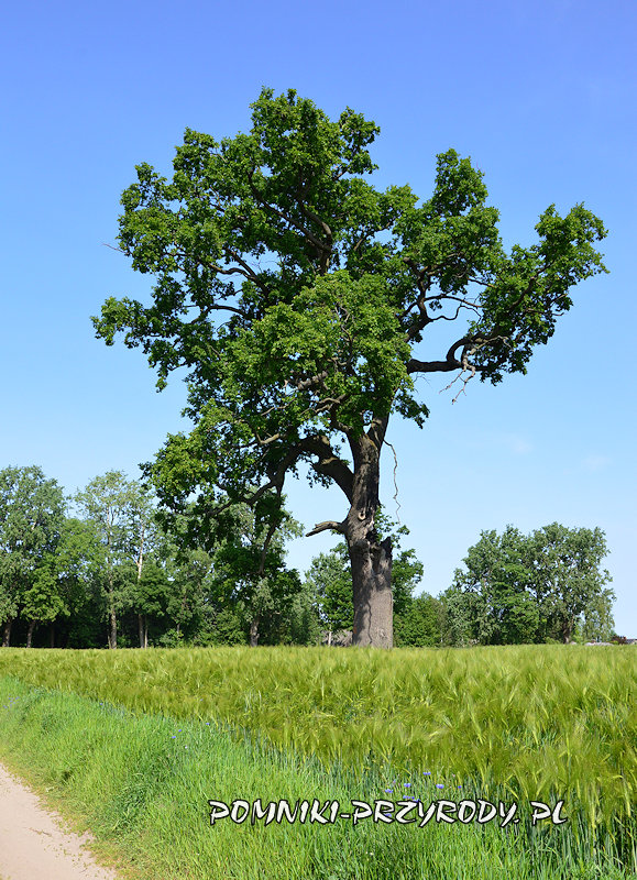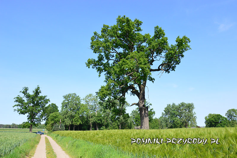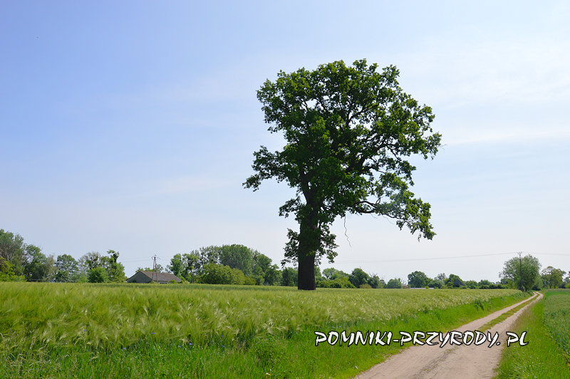 Widoczny już wcześniej po lewej stronie dąb rośnie na skraju pola uprawnego, kilka metrów od drogi.
