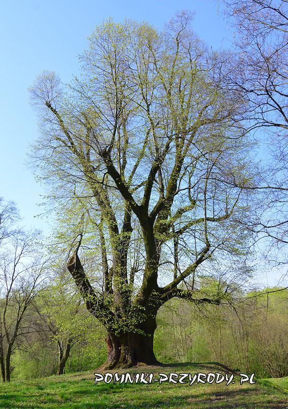 Druga pomnikowa lipa – jako jedyne pomnikowe drzewo oznaczone tabliczką – rośnie na skarpie, powyżej szosy.