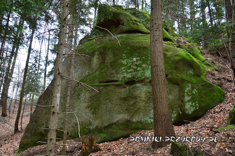 W lasach Woli Komborskiej, w obrębie Czarnorzecko – Strzyżowskiego Parku Krajobrazowego, na zachód od drogi nr 19 Rzeszów – Barwinek znajdują się wychodnie piaskowców, z których cztery, oddalone od siebie o kilkaset metrów, objęto już w 1963 r. ochroną pomnikową. W najliczniejszej grupie, w skład której wchodzi 15 skałek, usytuowana jest słynna Konfederatka – skałka o niezwykle fantazyjnym kształcie. Niestety, w przeciwieństwie do opisanych w poprzednich artykułach pomnikach przyrody nieożywionej do skałek nie prowadzi żadna ścieżka przyrodnicza, ani nawet żadna sensowna droga leśna co znacznie utrudnia odnalezienie geostanowiska. Niedaleko miejsca, gdzie granica powiatu krośnieńskiego i brzozowskiego przecina szosę nr 19, znajduje się drogowskaz „Działy 2 km”, wjeżdżamy w wąską, asfaltową drogę i po ok. 250 m zostawiamy auto na szerokim poboczu (GPS N 49°43’56.7″ , E 21°54’14.8″). Schodzimy lasem w kierunku północnym, przechodzimy pod linią wysokiego napięcia i już po kilkudziesięciu metrach odszukujemy pierwsze, zlokalizowane na zboczu pomnikowe skałki.