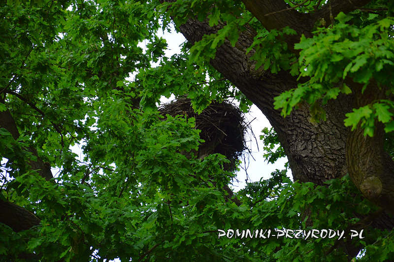 W koronie tego niezwykłego dębu swoje gniazdo uwiła rodzina bocianów białych.