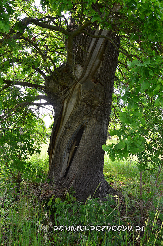 Jego pień o obwodzie 415 cm z jednej strony wygląda zdrowo, zaś z przeciwnej widoczny jest spory, podłużny ubytek oraz rozległa listwa piorunowa.