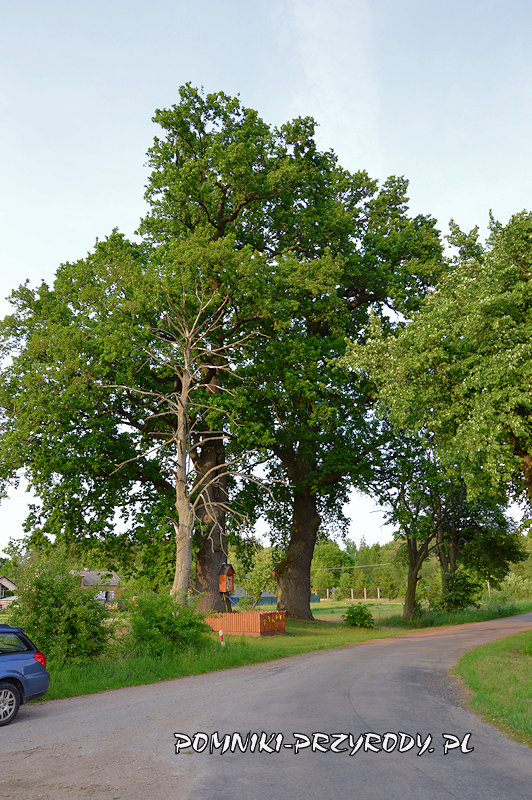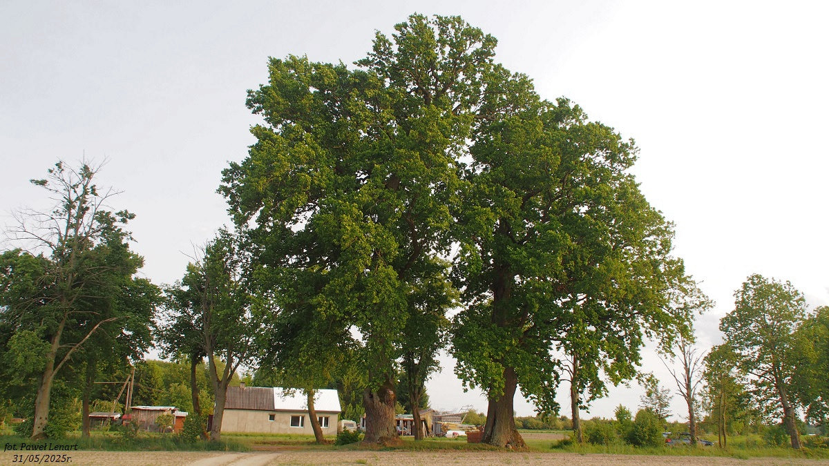 Nawet podczas najdokładniej przygotowanej wycieczki dendrologicznej może wydarzyć się coś niezaplanowanego (oby tylko pozytywnego). Czasem jakaś zamknięta, remontowana droga, czy też zawiłe algorytmy nawigacji satelitarnej wyprowadzą nas w ciekawe miejsce lub pod obiekt, któremu warto poświęcić kilka minut pomimo mocno napiętego grafiku. Tak też było na przełomie maja/czerwca, gdy autor tego artykułu wraz Pawłem Lenartem zbliżał się do opisanego w poprzednim artykule dębu o nazwie Uparty Mazur. Przejeżdżając przez wieś Luberadz zauważyliśmy dwa okazałe dęby, których nie mieliśmy w planach zobaczyć. Takiej okazji nie mogliśmy jednak przepuścić, natychmiast przystąpiliśmy do fotografowania sędziwych okazów.para pomnikowych dębów z LuberadzaLuberadz - para pomnikowych dębów