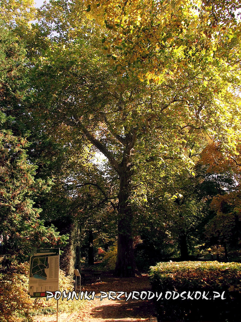 Idąc od niego alejką wzdłuż ogrodzenia natrafimy na pięknie ubarwionego jesienią tulipanowca amerykańskiego (obw. 282 cm, wys. 32 m).