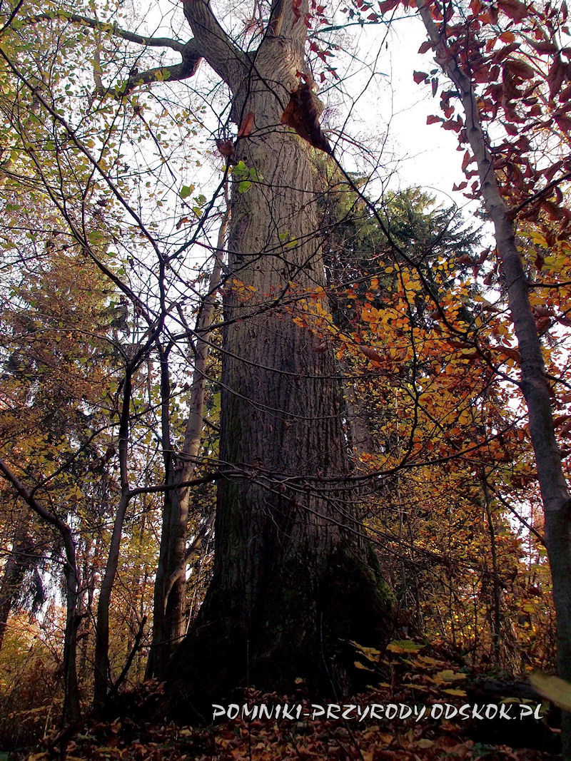 Okaz mierzy 260 cm w pierśnicy, wysokość sosny ok. 22 m.