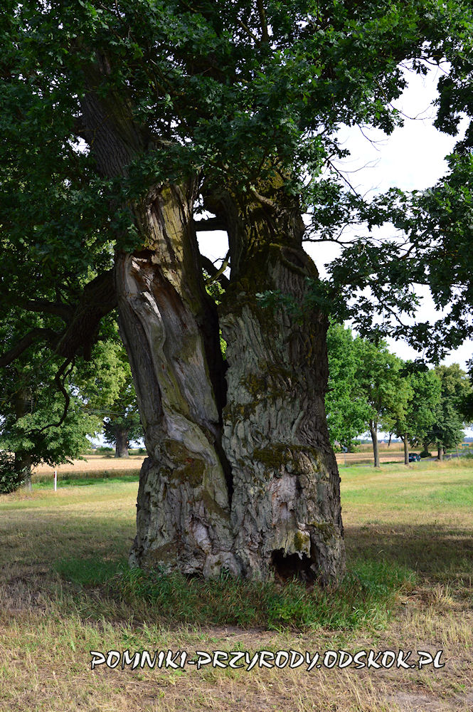 730 – letni dąb musi cierpieć na choroby wieku starczego – jego pień wewnątrz jest całkowicie wypróchniały, a od strony zachodniej znajduje się potężny ubytek sięgający wysokości kilku metrów.